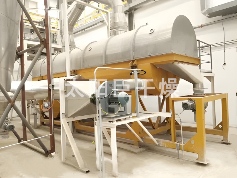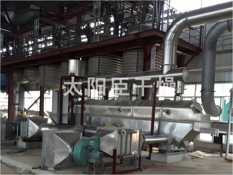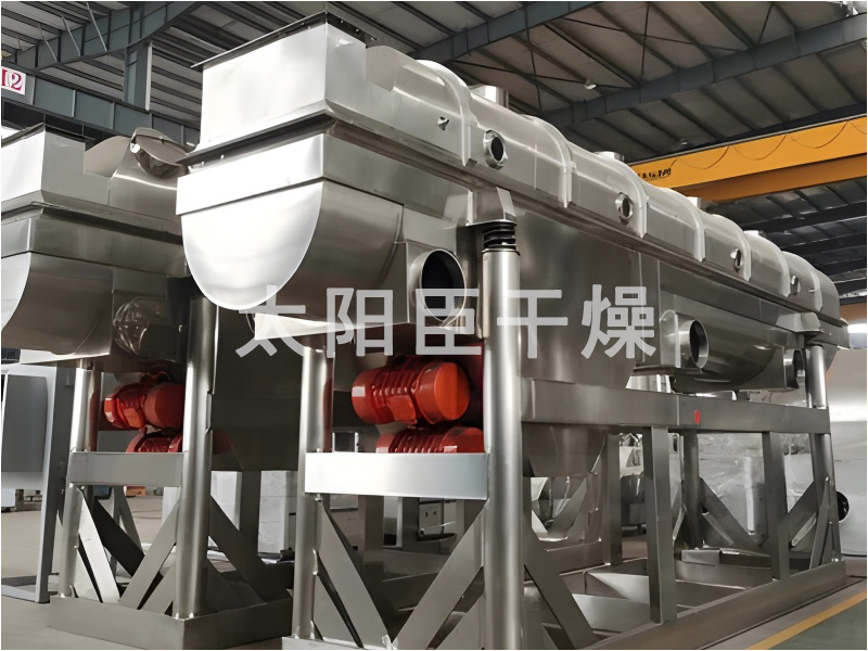 物料自进料进口进入机内,在振动力作用下,物料沿水平面流化床抛掷,向前连续运动,热风向上穿过流化床同湿物料换热后,湿空气经旋风分离器除尘后由排风1:3排出.干燥物料由排料进口排出。
