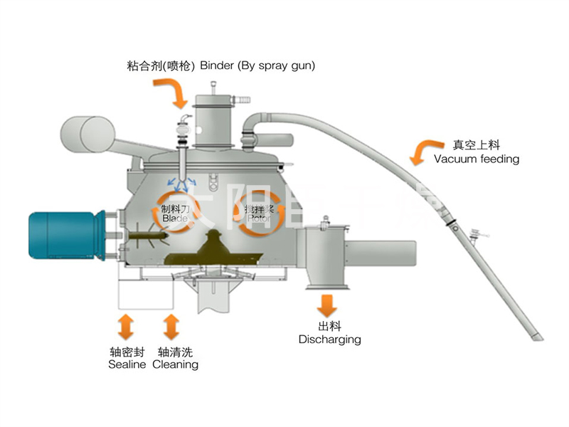 粉体物料与粘合剂在圆筒形容器中由底部混合浆充分混合成湿润软材,然后由侧置的高速粉碎桨切割成均匀的湿颗粒。