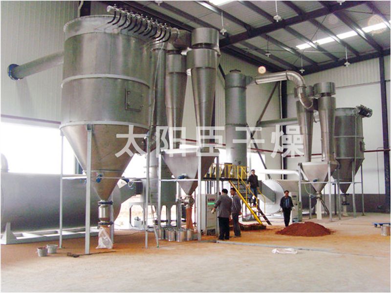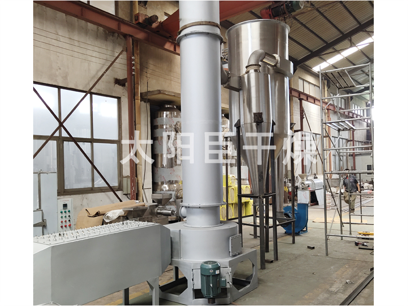 热空气切线进入干燥器底部,在搅拌器带动下形成强有力的旋转风场。膏状物料由螺旋加料器进入干燥器内,在高速旋转搅拌桨的强烈作用下,物料受撞击、磨擦及剪切力的作用下得到分散,块状物料迅速粉碎,与热空气充分接触、受热、干燥。脱水后的干物料随热气流上升,分级环将大颗粒截留,小颗粒从环中心排出干燥器外,由旋风分离器和除尘器回收,未干透或大块物料受离心力作用甩向器壁,重新落到底部被粉碎干燥。