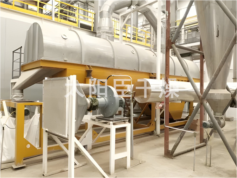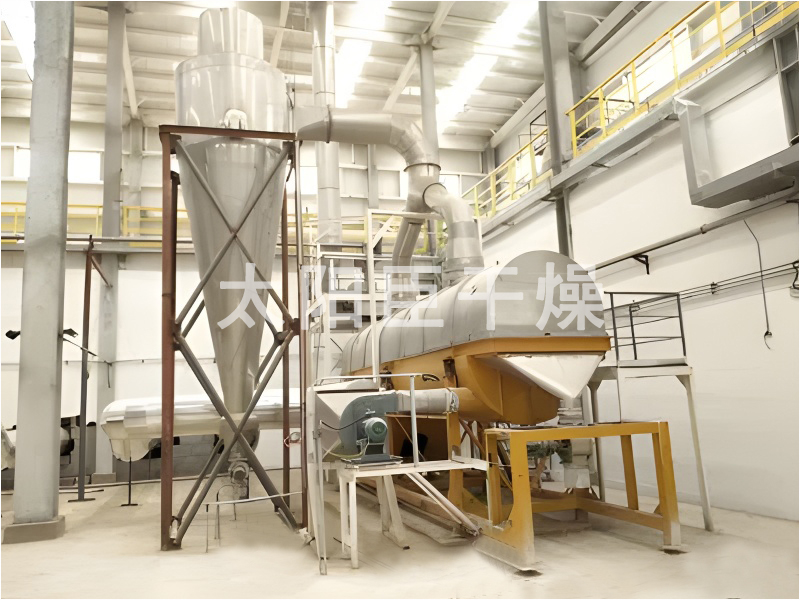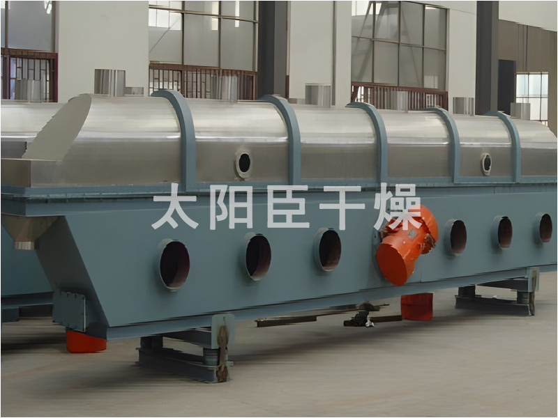 物料自进料进口进入机内,在振动力作用下,物料沿水平面流化床抛掷,向前连续运动,热风向上穿过流化床同湿物料换热后,湿空气经旋风分离器除尘后由排风1:3排出.干燥物料由排料进口排出。